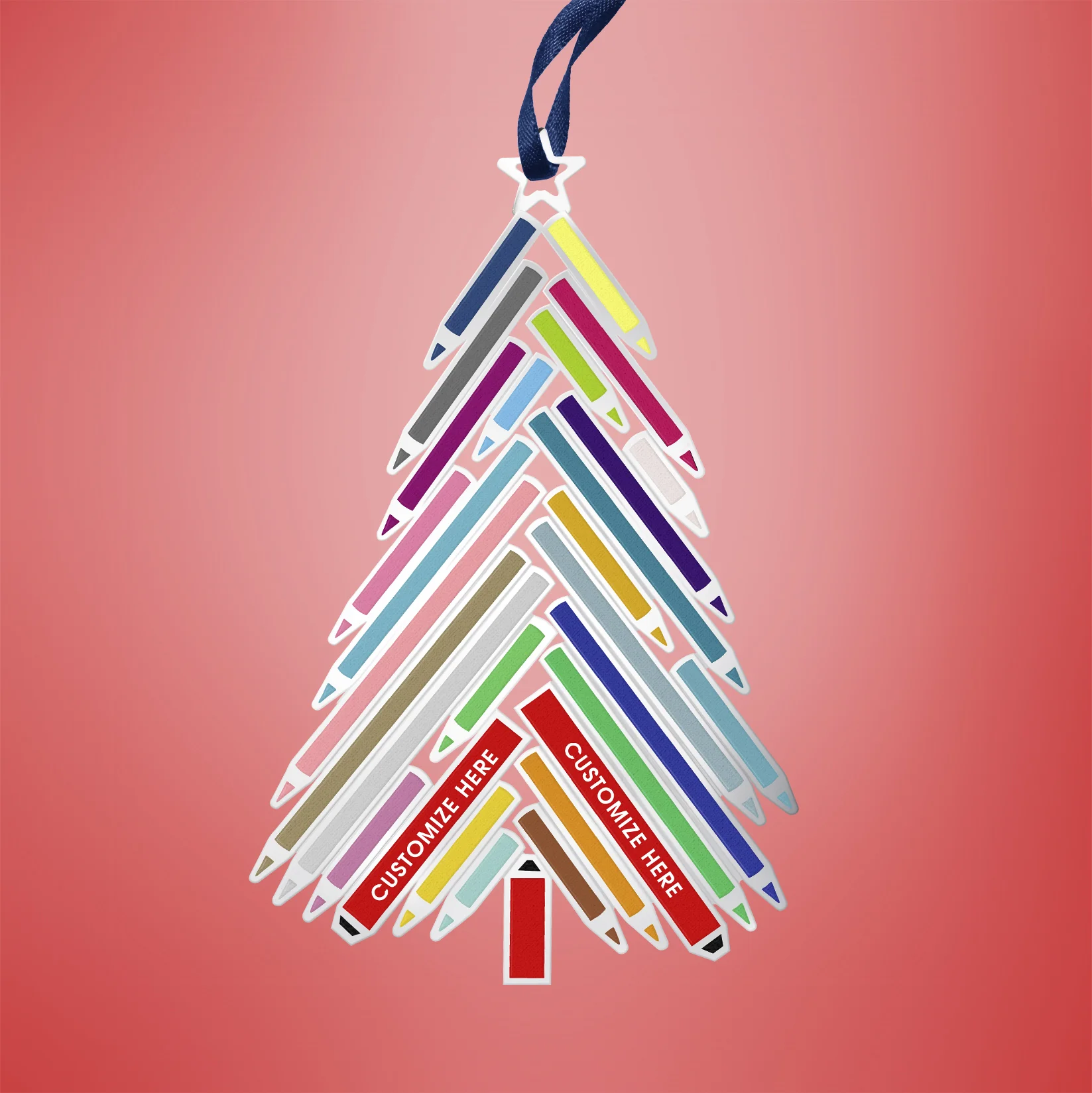 Our exclusive Pencil Tree ornament is a colorful and festive option for your modern clientele. There are two pencil locations on the front for your custom message.